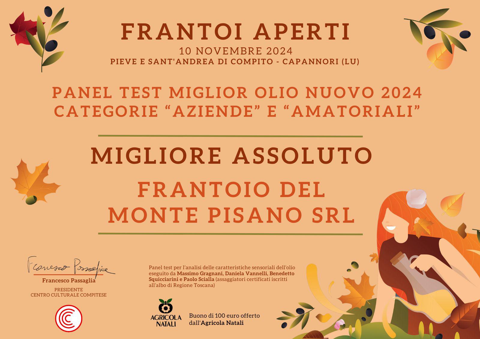 “Frantoio del Monte Pisano” EVOO, FRANTOIO DEL MONTE PISANO SRL – Vicopisano (PI) – TUSCANY - First Prize at the Frantoi Aperti Panel Test, Lucca 2024/2025