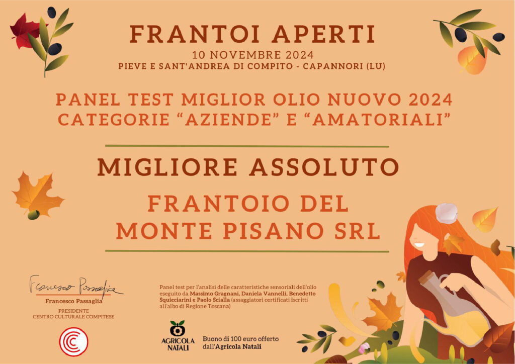 The extra virgin olive oil from Frantoio del Monte Pisano has been recognized as the best new oil 2024 in both “company” and “amateur” categories at Frantoi Aperti – Lucca, achieving first place overall in the Panel Test for EVO oil sensory characteristics analysis.