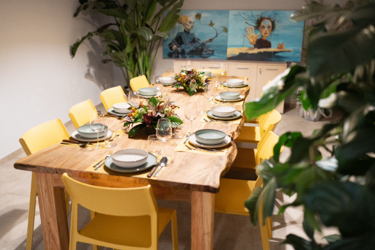 – 12 solid olive wood tables (80×80 cm), each seating 4, modular and adaptable to host up to 48 guests.